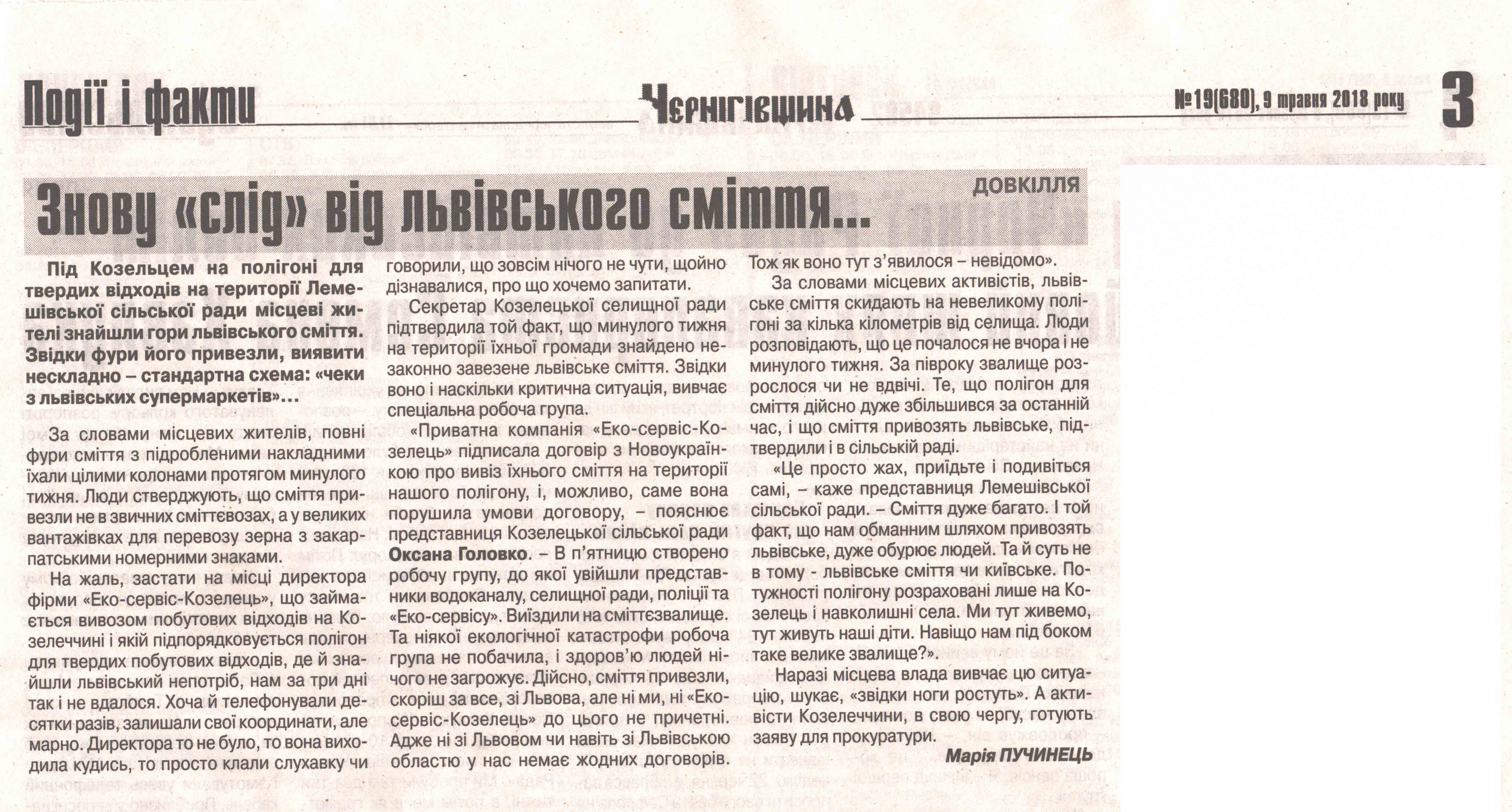 Тому матеріал «Знову «слід» від львівського сміття…» Марії Пучинець у газеті «Чернігівщина» № 19 від 9 травня 2018 року слід вважати недостовірним. Адже автор подає інформацію, спираючись на дані, які нібито надані секретарем селищної ради та керуючим справами (секретарем) виконкому, а також вказує пряму мову посадових осіб органів місцевого самоврядування, в той час як вони її не надавали.