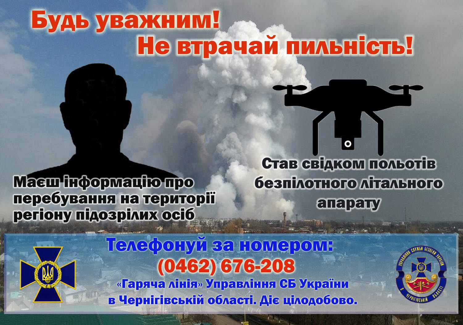 У разі надходження такої інформації просимо громадян звертатися безпосередньо до Управління СБ України в Чернігівській області (адреса: м. Чернігів, вул. Шевченка, 28), або скористатися номером «гарячої лінії» (0462) 676-208, чи електронною поштовою скринькою: Ця електронна адреса захищена від спам-ботів. Вам потрібно увімкнути JavaScript, щоб побачити її.