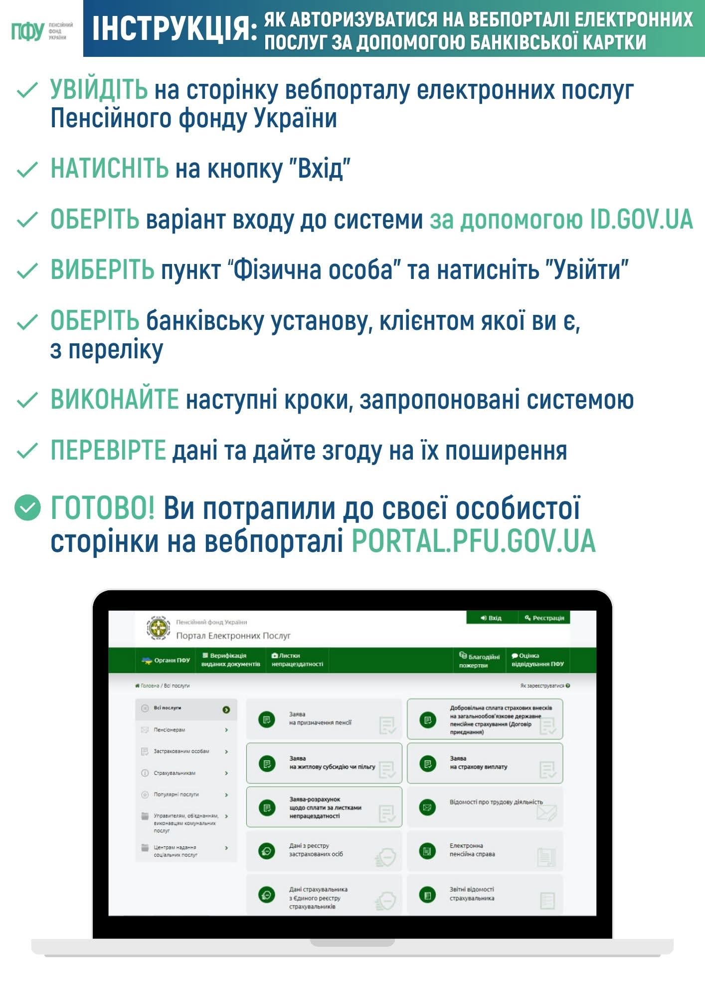 Авторизуватися на вебпорталі ПФУ можна: